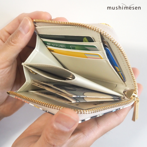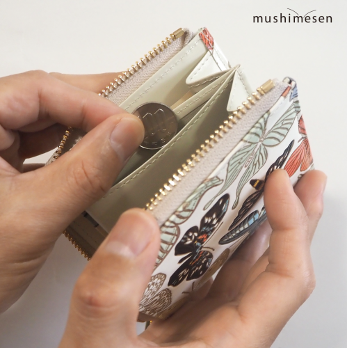 虫アートディレクター ムシメセン が日本の昆虫を描きデザインした「日本の昆虫シリーズ」のL字ファスナーミニ財布(オレンジ×ミント)です。